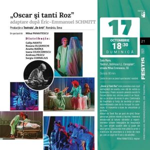 În perioada 11 – 21 octombrie 2021, la Chișinău se desfășoară un important Festival Internațional de teatru la care participă 22 de trupe de teatru din trei țări. Între acestea se numără și Teatrul de Artă din Deva, invitat la FESTIS Chișinău, unde actorii acestei instituții teatrale din județul Hunedoara au prezentat publicului spectacolul de succes ”Oscar și Tanti Roz”, o piesă în regia lui Mihai Panaitescu, primită cu multă căldură de către publicul din Chișinău.