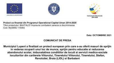 Municipiul Lupeni este beneficiarul proiectului cu titlul ”BAHTALO! Împreună combatem sărăcia și discriminarea”, co-finantat din Fondul Social European prin Programul Operațional Capital Uman, cod 115093, cu o valoare totala de 24.218.420,81 LEI.