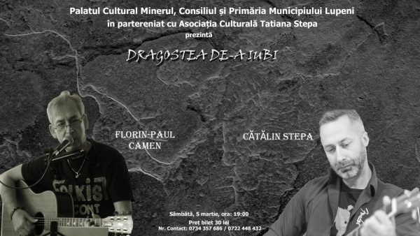 Evenimentul, care se va derula sub genericul ”Dragostea de-a iubi” este organizat de Asociația Culturală ”Tatiana Stepa”, în parteneriat cu Primăria și Consiliul local al municipiului Lupeni, iar publicul iubitor al acestui gen muzical este invitat la o reîntâlnire cu talentații și apreciații cantautori ai Lupeniului, Florin Paul Camen și Cătălin Stepa.
