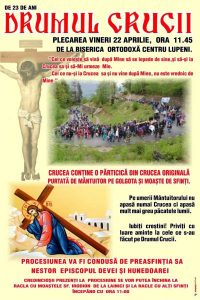 Şi în acest an, la cea de-a XXIII-a procesiune spre Golgota din Straja, care va avea loc vineri 22 aprilie 2022, începând cu ora 11,45 de la Biserica ortodoxă ”Sf. Nicolae” de lângă Cimitirul Eroilor din centrul municipiului Lupeni, sunt aşteptaţi din nou mii de credincioşi, de la oameni simpli la personalităţi ale vieţii publice din Valea Jiului şi din întreg judeţul Hunedoara, cu toţii uniţi în cuget şi-n simţiri în Vinerea Mare, de rememorarea patimilor lui Hristos. Procesiunea va fi condusă de Preasfinția Sa Nestor – Episcopul Devei și Hunedoarei. Credincioșii care vor fi prezenți la acest eveniment religios se vor putea închina, anul acesta, și la racla cu moaștele Sfântului Irodion de la Lainici și la racle cu alți sfinți, începând cu ora 11,00.