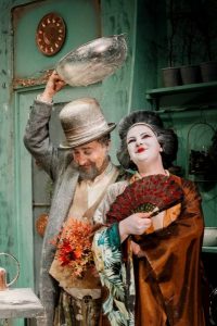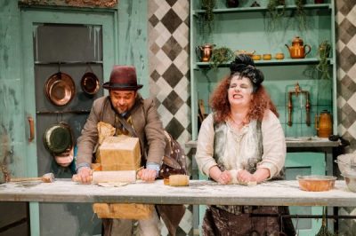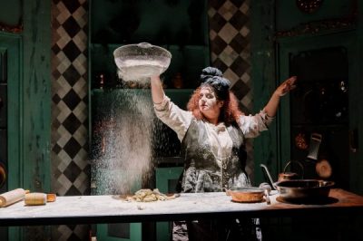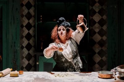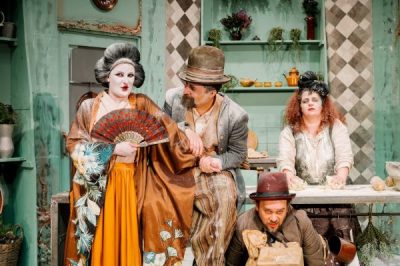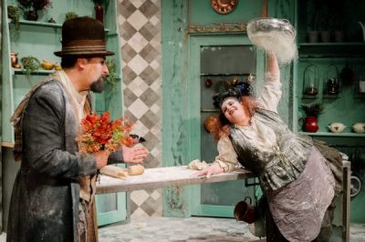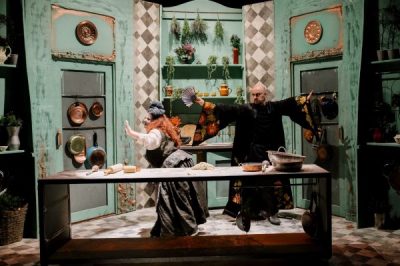 De altfel, întreaga intrigă a piesei se petrece în bucătăria Servitoarei din casa lui Stepan Stepanovici Chubukov, între oale, cratițe și tigăi care fac deliciul unui decor la fel de inspirat, realizat de Eliza Loboncz (care semnează scenografia acestui spectacol). Oana Liciu-Gogu face un rol de senzație în ”Servitoarea”, reușind să transforme un rol altminteri secundar, inexistent în cele două piese ale lui Cehov ce stau la baza acestei compilații, într-un rol de veritabil prim-plan. Și face acest lucru într-un mod cu atât mai admirabil cu cât, pe tot parcursul spectacolului, nu dă glas niciunei replici (poate cu excepția unor haioase și bine punctate onomatopee), dar reușește să atragă toată atenția prin spectacolul absolut fascinant al creării, modelării și utilizării aluatului și al tuturor ingredientelor acestuia, dar și prin felul în care, cu priviri și gesturi oacheșe, interacționează rând pe rând cu toate celelalte personaje, în scene de un haz provocator, aplaudate frenetic din sală.
