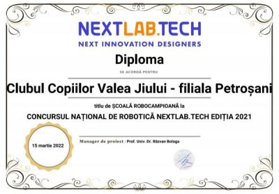 Clubul Copiilor din Valea Jiului a primit titlul de Școală Robo-campioană, după ce mai mulți elevi pasionați de robotică din cadrul acestei instituții de învățământ, coordonați au obținut rezultate remarcabile la concursul național NEXTLAB.TECH
