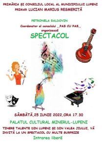 Palatul Cultural ”Minerul” din municipiul Lupeni găzduiește sâmbătă, 25 iunie 2022, începând cu ora 17,30 un nou spectacol al Cenaclului ”Pas cu pas” din localitate, coordonat de prof. Petronela Baldovin.