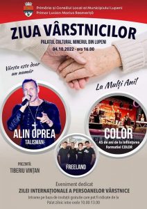 Evenimentul va fi marcat anul acesta, la Lupeni, marți, 4 octombrie, când persoanele vârstnice domiciliate în municipiul Lupeni sunt invitate la concertul prilejuit de sărbătoarea Zilei Internaționale a Persoanelor Vârstnice. Pe scena Palatului Cultural ”Minerul” vor urca, în acest spectacol extraordinar, renumita formație ”Color Grup” din Valea Jiului (care aniversează, la rândul ei, în acest an, 45 de ani de existență), împreună cu ”aripa tânără” a grupului artistic condus de Fane Abrădoai – Formația ”Freeland”, dar și apreciatul artist Alin Oprea alias ”Talisman”. Programul artistic va începe de la ora 16,00 și va fi precedat de o scurtă ceremonie de premiere a familiilor care au împlinit 50 de ani de căsnicie.