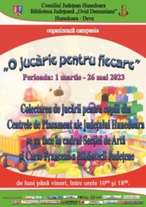 În fiecare an, în perioada premergătoare Zilei Internaționale a Copilului, 1 iunie, Biblioteca Județeană „Ovid Densusianu” Hunedoara – Deva se mobilizează în acțiunea intitulată ”O jucărie pentru fiecare, o acțiune caritabilă inițiată în urmă cu câțiva ani cu scopul declarat de a aduce un strop de bucurie copiilor vitregiți de soartă din județul Hunedoara, în preajma Zilei Internaționale a Copiilor.