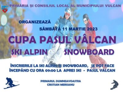Primăria și Consiliul local al municipiului Vulcan organizează sâmbătă, 11 martie 2023 în stațiunea turistică Pasul Vîlcan o nouă edițiue a tradiționalui eveniment sportiv ”Cupa Pasul Vîlcan” la schi alpin și snowboard.