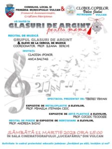 Grație acestui parteneriat, sâmbătă, 11 martie 2023, de la ora 15,00 vulcănenii sunt așteptați la sala Cinematografului ”Luceafărul” unde va fi prezentat un emoționant spectacol cultural-artistic sub genericul ”Glasuri de argint pentru mama”. Prof. Ileana Berki ne dă asigurări că, la acest eveniment, cele mai frumoase melodii și imnuri dedicate mămicilor vor răsuna din ”glasuri de argint” și vor umple de bucurie inimile acestora și-i vor face pe spectatori să simtă din plin sentimentul celei mai profunde dragoste: dragostea de mamă. În plus, evenimentul se va bucura de prezența unor artiști valoroși ai Văii Jiului, precum Claudia Șponor și Anca Baltag, care vor susține recitaluri în cadrul spectacolului.
