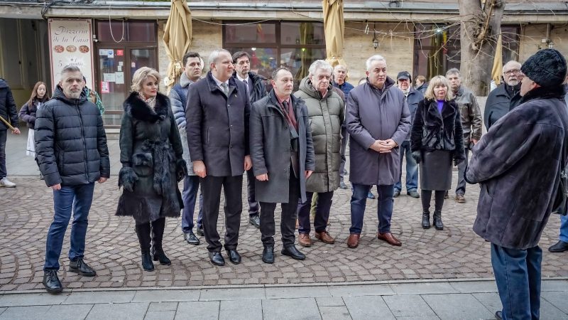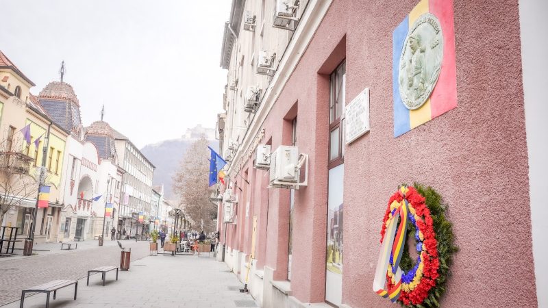 Pe frontispiciul acestei clădiri, o delegație formată din Costel Avram, administratorul public al Consiliului Județean Hunedoara, Ion Bădin, vicepreședintele Consiliului Județean Hunedoara, Doinița Maria Bălănesc, consilier județean, Ioan Ștaier, consilier județean, prof. dr. Liviu Lazăr, Ioan Sebastian Bara, managerul Bibliotecii Județene „Ovid Densusianu” Hunedoara – Deva, Luminița Mariana Benea, directoarea Liceului Tehnologic „Grigore Moisil” Deva, Sorin Marin Demeter, directorul Colegiului Tehnic „Transilvania” Deva, Adrian Cristian Liga, directorul Liceului cu Program Sportiv „Cetate” Deva, Louise Gabriel Tripa, directorul Colegiului Național Pedagogic „Regina Maria” Deva, Ciprian Nicolae Roman, managerul Centrului de Cultură și Artă al Județului Hunedoara, Radu Barb, directorul general al Direcției Generale de Administrare Monumente și Promovare Turistică a Județului Hunedoara, scriitorii Dumitru Tâlvescu, Aurelian Sârbu, Dumitru Dumitrescu, elevi de la Colegiul Tehnic „Transilvania” Deva care au purtat steaguri tricolore, profesori și elevi de la instituțiile de învățământ din Deva, a depus o jerbă de flori.