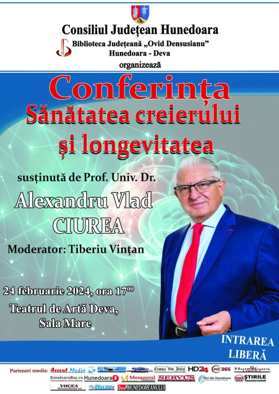 Biblioteca Județeană „Ovid Densusianu” Hunedoara – Deva, cu sprijinul Consiliului Județean Hunedoara, organizează în ziua de 24 februarie 2024, ora 17:00, în Sala Mare a Teatrului de Artă din Deva, o întâlnire cu reputatul prof. univ. dr. neurochirurg Alexandru Vlad Ciurea, care va susține conferința cu tema „Sănătatea creierului și longevitatea”.