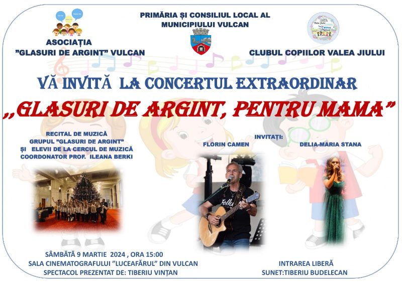 Spectacolul ”Glasuri de argint” pentru mama este organziat de Primăria și Consiliul local al municipiului Vulcan, în parteneriat cu Asociația ”Glasuri de Argint” și Clubul Copiilor Valea Jiului. Intrarea este liberă!