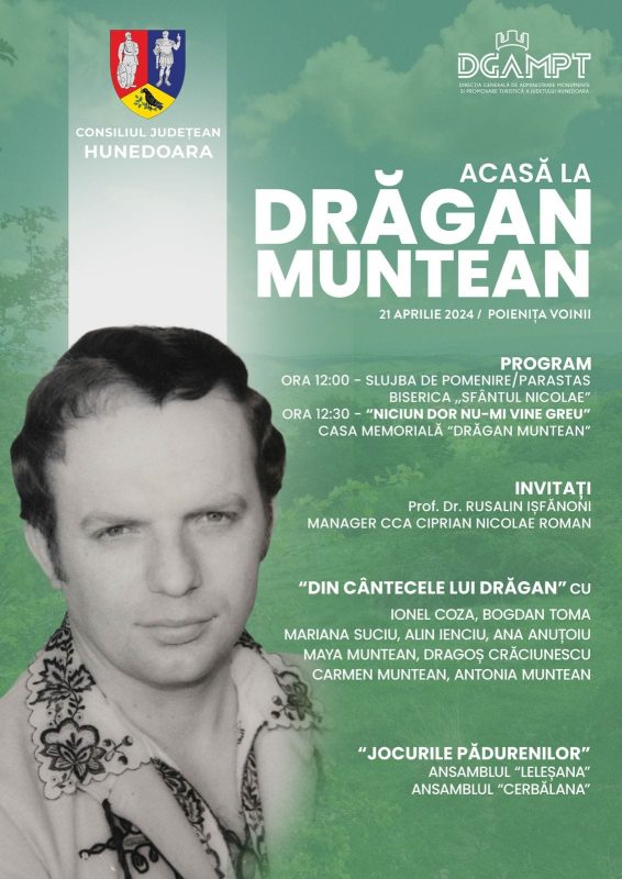 Potrivit reprezentanților DGAMPT Hunedoara, duminică, 21 aprilie 2024 la Casa Memorială ”Dragn Muntean” din Poienița Voinii se va desfășura evenimentul omagial ”Acasă la Drăgan Muntean”. În cadrul acestuia, pe lângă slujba de parastas de la Biserica ”Sf. Nicolae”, va avea loc și un simpozion cu tema ”Nici un dor nu-mi vine greu” (de la ora 12,30), după versurile unuia din îndrăditele cântece ale doinitorului Ținutului Pădurenilor. Vor fi invitați să conferențieze la acest eveniment reputatul etnolog hunedorean prof.dr. Rusalin Ișvănoni și apreciatul solist de muzică populară Ciprian Roman, discipol al lui Drăgan Muntean, în prezent director al Centrului de Cyltură și Creație Populară al județului Hunedoara.