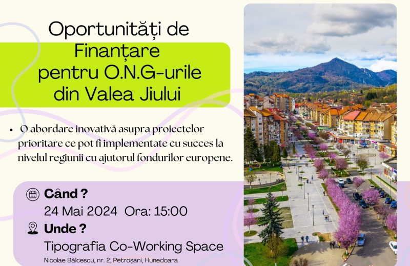 Asociația pentru Dezvoltare Teritorială Integrată (ADTI) Valea Jiului organizează în data de 24 mai 2024, ora 15:00 la Petroșani, o sesiune informativă destinată reprezentanților societății civile, în cadrul căruia ONG-urile au șansa să afle noutăți, dar și oportunități despre cum își pot dezvolta activitatea cu ajutorul fondurilor europene disponibile.