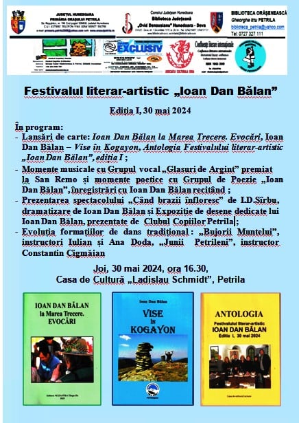 Prima ediție a Festivalului literar-artistic „Ioan Dan Bălan” va avea loc la Casa de cultură ”Ladislau Schmidt” din orașul Petrila în data de 30 mai 2024, de la ora 17,00. Ziua nu a fost aleasă întâmplător, aceasta marcând data nașterii scriitorului Ioan Dan Bălan, în anul 1951. ”Ioan Dan Bălan a iubit foarte mult aceste locuri și oamenii Petrilei și ai Văii Jiului. Lor le-a dedicat cele mai frumoase poeme ale sale și aceste locuri le-a cântat cu drag în scrierile sale. Dincolo de regretul trecerii sale în lumea de dincolo rămâne amintirea acestui om deosebit și știu că Ioan Dan Bălan și-ar fi dorit ca orice am face în memoria sa, să facem cu bucurie, să facem un motiv de sărbătoare. De aceea am ales ca dată pentru organizarea acestui festival nu data trecerii sale în eternitate, ci data în care s-a născut, pentru că astfel îl omagiem nu comemorându-l ci, așa cum și el și-ar fi dorit, sărbătorindu-l”, spune Elisabeta Bogățan, soția regretatului scriitor.