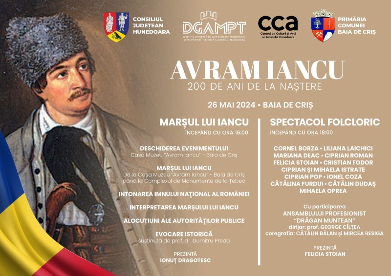 Astfel, la Casa Muzeu „Avram Iancu” din Baia de Criș și în Complexul de Monumente Țebea, patrioții români sunt așteptați la „Marșul lui Iancu”, o acțiune de excepție a cărei scop este omagierea marelui erou transilvănean. Evenimentul este organizat de CJH, prin DGAMPT Hunedoara în parteneriat cu Centrul de Cultură și Artă al județului Hunedoara șli Primăria Baia de Criș.