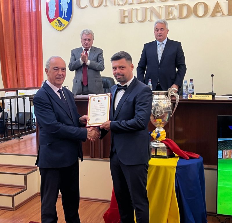 Luni, 27 mai 2024 s-a desfășurat una dintre cele mai emoționante înfruniri ale forului administrației județene. Întrunit în ședință extraordinară, plenul Consiliului județean Hunedoara a aprobat, în unanimitate, acordarea titlului de ”Cetățean de onoare al județului Hunedoara”, antrenorului echipei de fotbal FC Corvinul Hunedoara și acordarea de ”Diplome de excelență” jucătorilor și membrilor staff-ului clubului sportiv.