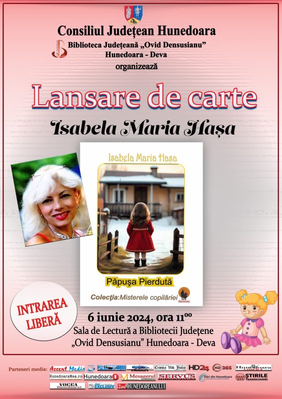 Biblioteca Județeană „Ovid Densusianu” Hunedoara – Deva, cu sprijinul Consiliului Județean Hunedoara, organizează în ziua de 6 iunie 2024, ora 11:00, la Sala de Lectură a Bibliotecii Județene „Ovid Densusianu” Hunedoara – Deva, un eveniment cultural prilejuit de lansarea cărții „Păpușa pierdută” a cărei autoare este Isabela Maria Hașa.