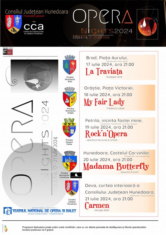 Consiliul Județean Hunedoara invită melomanii la o nouă ediție a Festivalului de operă în aer liber „Opera Nights”. Evenimentul ajuns la cea de-a X-a ediție are loc săptămâna viitoare și va oferi melomanilor cinci seri de operă memorabile, în tot atâtea locații inedite din 5 localități din județul Hunedoara.