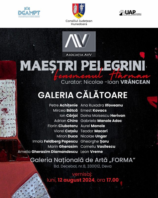 Consiliul Județean Hunedoara și DGAMPT Hunedoara vă invită la deschiderea expoziției de grup „MAEȘTRI PELEGRINI – GALERIA CĂLĂTOARE”, ce va avea loc luni, 12 august 2024, la Galeria Națională de Artă „FORMA” din Deva, începând cu ora 17.00.