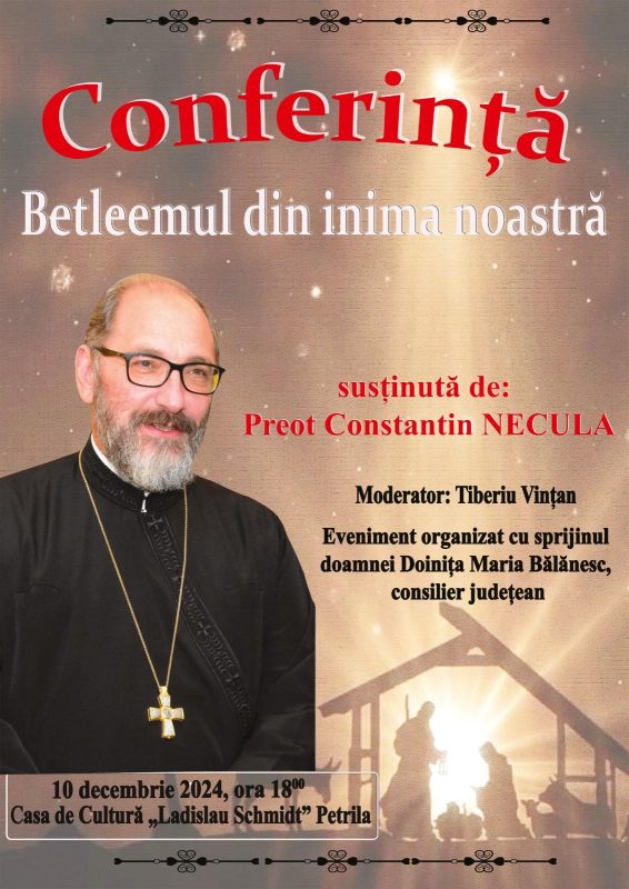 „Oricare ar fi bucuriile noastre așa cum oricare ar fi frământările noastre, la momentul sărbătorilor de la finalul unui an căutăm împăcarea cu semenii noștri și cu noi înșine, căutăm să dăruim și, în același timp, să fim dăruiți, iar ceea ce este și mai important, căutăm să-l descoperim pe bunul Dumnezeu în inimile noastre. Acestea sunt gândurile pe care le-am avut atunci când i-am transmis Părintelui Constantin Necula invitația de a veni, în prag de sărbătoare, la noi în Valea Jiului, la Petrila și am primit cu mare bucurie, dar și cu mare onoare, încuviințarea acestui înțelept slujitor al credinței, atât de apreciat de noi toți. Mă bucur nespus că am astfel bucuria de a dărui oamenilor din comunitatea căreia îi aparțin o întâlnire de suflet cu Părintele Constantin Necula și vă invit să-l ascultăm împreună marți, 10 decembrie 2024, de la ora 18,00 la Casa de cultură „Ladislau Schmidt” din otrașul Petrila, conferențiind despre „Betleemul din inima noastră”, într-un dialog cu jurnalistul Tiberiu Vințan. Participarea este liberă, desigur sub rezerva locurilor limitate din sala de spectacol. Vă aștept cu mare drag la acest eveniment”, spune Doinița Maria Bălănesc, consilier județean.