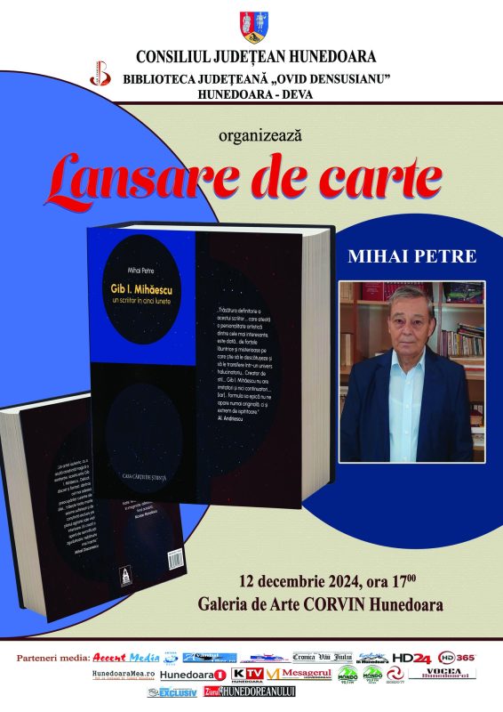 Biblioteca Județeană „Ovid Densusianu” Hunedoara – Deva, cu sprijinul Consiliului Județean Hunedoara, organizează în ziua de 12 decembrie 2024, ora 17:00, la Galeria de Arte „Corvin” din Hunedoara, un eveniment cultural cu totul deosebit prilejuit de lansarea volumului „Gib I. Mihăescu, un scriitor în cinci lunete” al cărui autor este binecunoscutul dascăl și scriitor Mihai Petre.