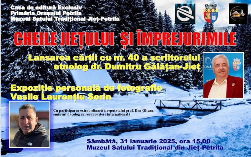 De altfel  așa cum bine aprecizat și reputatul autor, cartea „Cheile Jiețului și împrejurimile – ieri și azi” urmează să fie prezentată oficial publicului din Valea Jiului în cadrul unui prim eveniment cultural purtând marca „EXCLUSIV” din anul 2025, vineri, 31 ianuarie de la ora 15,00 la Muzeul Satului Tradițional de la Jieț-Petrila. Tot cu acest prilej, va avea loc aici și vernisajul unei expoziții personale de fotografie ce poartă amprenta apreciatului fotograf petrilean Vasile Laurențiu Sorin. Mai mult, lansarea volumului cu nr. 40 a dr. Dumitru Gălățan Jieț și lansarea expoziției de fotografii semnată de Vasile Laurențiu Sorin, se bucură de participarea extraordinară a reputatului dacolog cu recunoaștere națională și internațională prof. Dan Oltean.