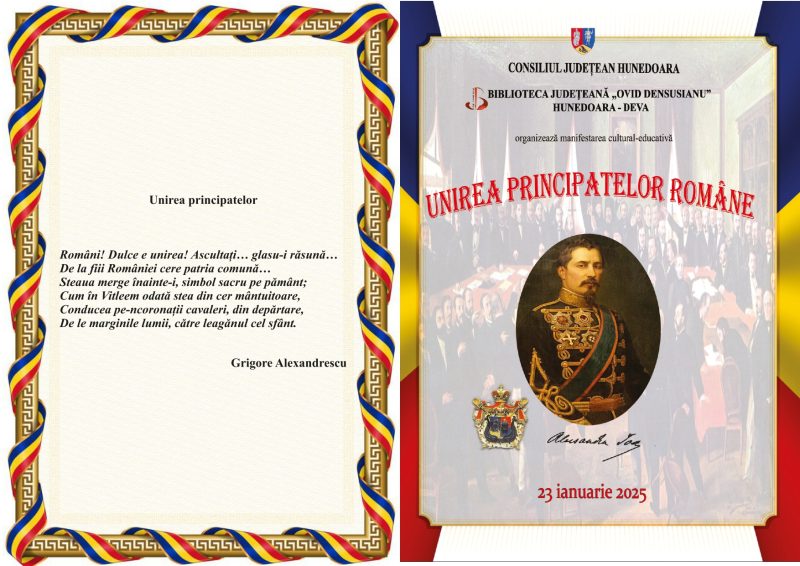 Biblioteca Județeană „Ovid Densusianu” Hunedoara – Deva, în parteneriat cu colegiile și liceele devene, organizează în data de 23 ianuarie 2025, ora 10:00, o manifestare cultural-educativă menită să cinstească amintirea unuia dintre cele mai îndrăgite momente din istoria românilor: Unirea Principatelor Române de la 24 ianuarie 1859.