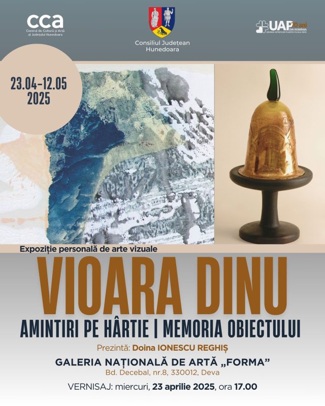 Consiliul Județean Hunedoara, Centrul de Cultură și Artă al Județului Hunedoara, în parteneriat cu Filiala Deva a Uniunii Artiștilor Plastici din România, vă invită la deschiderea expoziției „AMINTIRI PE HÂRTIE/MEMORIA OBIECTULUI”, a artistei VIOARA DINU. Evenimentul va avea loc miercuri, 23 aprilie 2025, la Galeria Națională de Artă „FORMA” din Deva, începând cu ora 17.00.