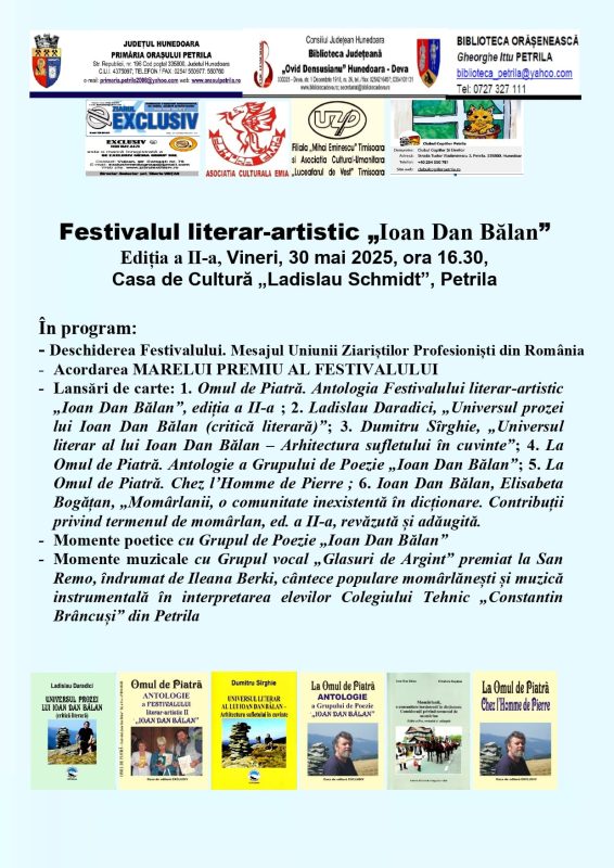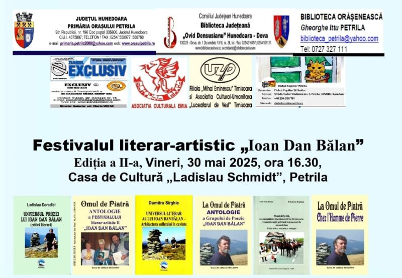 Cu satisfacția unei depline reușita la prima ediție, din anul 2024, la Petrila urmează să aibă loc vineri, 30 mai 2025, cea de-a doua ediție a Festivalului literar-artistic „Ioan Dan Bălan”. Evenimentul, rod al dorinței și al strădaniilor scriitoarei Elisabeta Bogățan de a păstra vie amintirea celui care a fost apreciatul scriitor petrilean Ioan Dan Bălan, eminent om de cultură și valoros cetățean de onoare al orașului Petrila, festivalul cultural care poartă numele regretatului om de cultură, trecut la cele veșnice la finele anului 2022, se desfășoară și anul acesta la final de ”Florar”, într-o zi cu semnificație aparte.