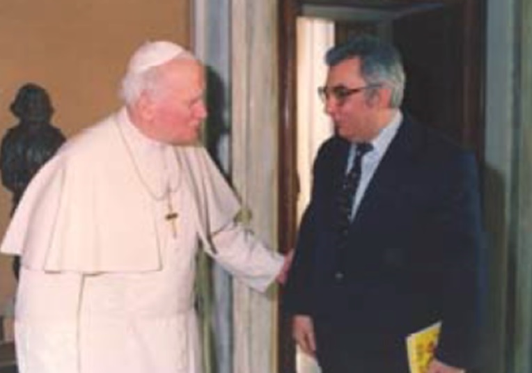 – Vezi cum istoria face dreptate? Nu Walesa, ci Papa Ioan Paul al II-lea a dat aripi Poloniei și adevăratei bătălii pentru o lume mai dreaptă, fără comunism. El a fost un stegar mic. Pontiful a fost un Papă pentru mileniul trei, așa cum menționam într-un volum apărut la Editura Colosseum în anul 2000, lansată la Uniunea Scriitorilor, împreună cu Laurențiu Ulici, în prezența nunțiului apostolic J. Perisset. Dacă vom găsi spațiu în dialogurile noastre, merită să relevăm cuvintele rostite de Episcopul Romei în timpul vizitei Sale din 9-11 mai la București. Și ar merita. Anul acesta se împlinesc 20 de ani de la trecerea sa în rândul sfinților. Apropo Eminescu. Știi că Papa a rostit Ruga Luceafărului nostru în Piața Sfântul Petru de la Roma – în limba română?