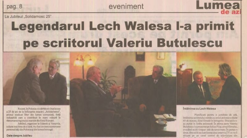– Întâlnirea cu Walesa, ca toate lucrurile importante din viaţa mea, s-a produs întâmplător. Un tânăr regizor polonez, Jacek Raginis, m-a solicitat să-l ajut în scrierea unui scenariu de film, despre un caz puţin cunoscut de disidenţă româno-poloneză. Este vorba de muncitorul clujean Iuliu Filip, care, în octombrie 1981, când la Gdansk a avut loc congresul de constituire a Solidarităţii, s-a gândit să le trimită organizatorilor o scrisoare de felicitare. A scris doar câteva rânduri: “Urez mult succes primului sindicat liber din lumea comunistă!” Om onest, s-a semnat lizibil şi a pus data. A lipit plicul şi a scris adresa destinatarului: Lech Walesa, Gdansk, Polonia. Nu s-a grăbit să o pună la poştă. Bănuia el ca va fi înhăţată de securitate. A cumpărat o sticlă de coniac, s-a dus la bazarul din Cluj unde veneau frecvent turişti polonezi să facă mici negoţuri. A ales unul care i s-a părut demn de încredere, i-a dat sticla şi plicul, rugându-l să-l trimită din Polonia la destinaţie. Polonezul, om serios, s-a ţinut de cuvânt, Aşa se face că în ajunul Congresului, scrisoarea lui Iuliu Filip a ajuns pe biroul lui Lech Walesa. Fiind un gest de solidaritate internaţională, sindicaliştii polonezi au citit scrisoarea la conferinţa de presă, unde erau prezenţi 300 de ziarişti occidentali. Fireşte, scrisoarea românească şi numele lui Iuliu Filip au înconjurat rapid mapamondul, supărându-l la culme pe Ceauşescu. A doua zi Iuliu Filip era arestat, judecat în regim expres şi condamnat la 6 ani de închisoare. Şase ani pentru o frază nevinovată. Tare scumpe erau serviciile poştale în Romania Socialistă. De fapt v-am povestit deja filmul “Scrisoare românească” la al cărui scenariu am fost coautor. Eroul principal şi realizatorii filmului au fost invitaţi la Varşovia şi la Gdansk în 2006, la manifestările prilejuite de împlinirea a 25 de ani de la înfiinţarea Solidarităţii. Acolo i-am cunoscut, printre alţii, pe Jeliu Jelev (fost Preşedinte al Bulgariei), pe dramaturgul Vaclav Havel, fost Preşedinte al Cehiei, Erau invitaţi de seamă, din toată lumea, iar Walesa nu-şi vedea capul de treburi. Dar “Scrisoarea românească” evocată chiar în deschiderea festivităţilor, l-a marcat. Întâlnirea, cu Walesa, planificată pentru 20 minute, a durat o oră.
