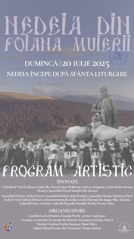 Consiliul Local și Primăria Orașului Petrila, împreună cu Asociația Crescătorilor de Animale din Muntele Sterminosu și Poiana Muierii, Parohia Ortodoxă Petrila-Cimpa și Schitul „Sfântul Prooroc Ilie Tesviteanul” din Poiana Muierii organizează și în acest an, în data de 20 iulie 2025, tradiționala ”NEDEIE DIN POIANA MUIERII”, manifestare dublată de hramul schitului monahal slujit în acest loc de măicuțele de la Mănăstirea Oașa.