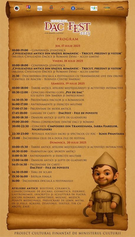 Festivalul debutează astăzi, la Deva, cu o Conferință despre civilizațiile antice, eveniment găzduit la Muzeul Civilizației Dacice și Romane iar deschiderea oficială va avea loc vineri seara, în centrul orașului Simeria. Programnul complet al evenimentului este următorul: