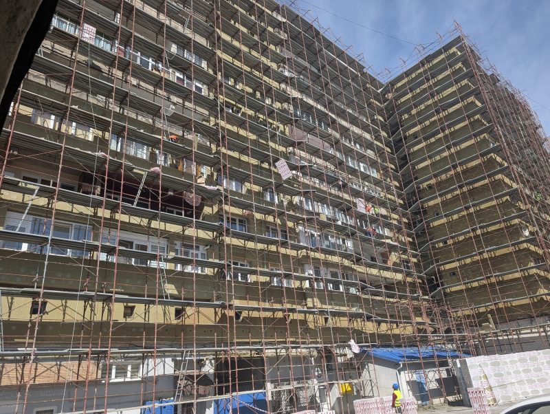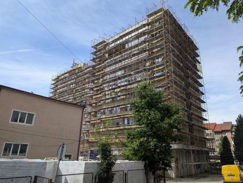 Cele două clădiri sunt înconjurate de schele din metal, iar muncitorii de pe acest șantier de lucrări de la Petroșani au început „îmbrăcarea” zidurilor cu elemente moderne de eficientizare energetică a clădirilor.