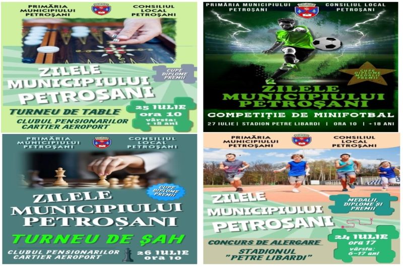 Primăria și Consiliul local al municipiului Petroșani derulează la finalul lunii iulie 2025, în cadrul programului de activități prilejuite de Zilele Municipiului Petroșani, o serie de competiții sportive destinate amatorilor, care se vor pyutea întrece la alergare, șah, table și minifotbal.