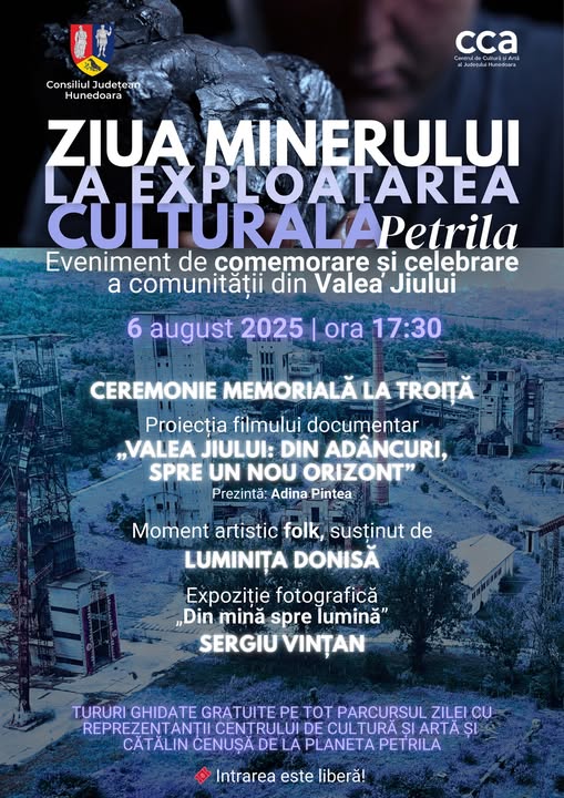 Potrivit directorului de patrimoniu al Centrului de Cultură și Artă al județului Hunedoara, Doinița Maria Bălănesc, evenimentul va fi unul de comemorare și celebrare a comunității din Valea Jiului, dedicat celor care, de-a lungul timpului, și-au dat viața pentru condiții mai bune de muncă și trai. De aceea, acesta se va deschide cu o scurtă ceremonie memorială la Troița din incinta Ansamblului Istoric Mina Petrila (ora 17,30), fiind urmat de premiera filmului documentar „Valea Jiului, din adâncuri spre un nou orizont” realizat de HD365TV (ora 18,00), de un concert folk al tinerei și talentatei cantautoare Luminița Donisă (ora 19,00), iar eu vă invit pe parcursul întregii zile de 6 august să vizitați expoziția mea permanentă de fotografii „Din mină spre lumină” în sala „Ladislau Schmidt” de la Mina Petrila, o incursiune vizuală în viața minerilor și un omagiu adus unei meserii emblematice.