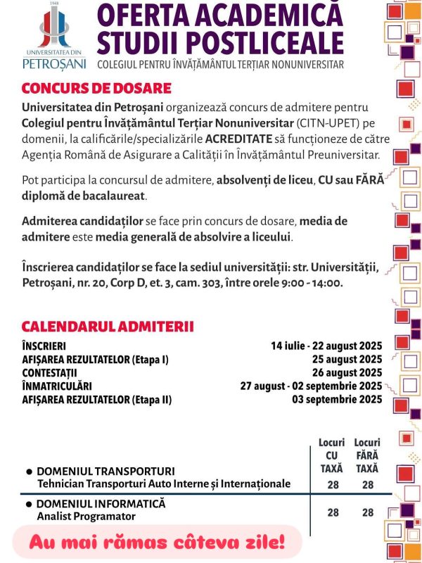 Înscrierea candidaților pentru cele două specializări acreditate la Universitatea din Petroșani, în Colegiul Terțiar Nonuniversitar se poate face până la data de 22 august 2025, rezultatele admiterii urmînd să fie afișate două zile mai târziu.