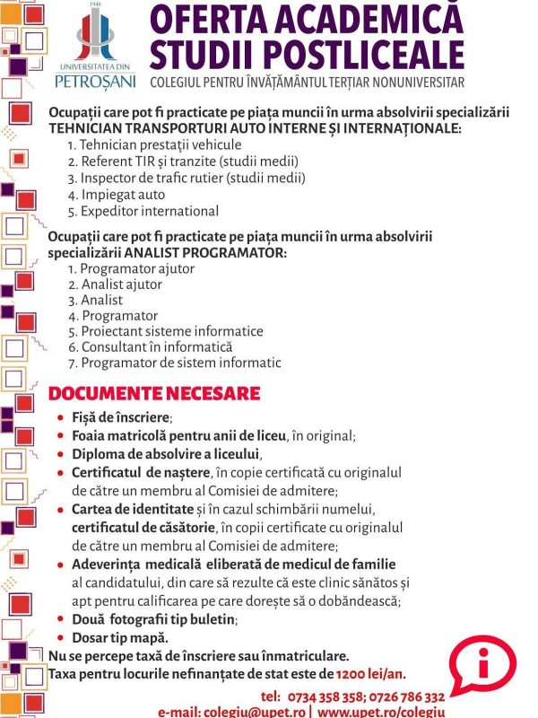 „Avem două specializări acreditate pe Colegiul Terțiar Nonuniversitar, în domeniul informaticii și al transporturilor, respectiv specializările de Analist programator, respectiv Tehnician transporturi auto interne și internaționale. Sunt disponibile câte 28 de locuri bugetate de stat pentru fiecare dintre aceste specializări, la care se adaugă alte câte 28 de locuri cu taxă, pentru fiecare specializare. Cei care optează să urmeze acest colegiu de pregătire postliceală în cadrul Universității noastre vor avea parte de practică în firme de specialitate, pentru o tranziție ușoară către piața muncii, de profesori de elită, de multiple oportunități de angajare”, spune rectorul Universității din Petroșani, prof.univ.dr.ing. Sorin Mihai Radu.