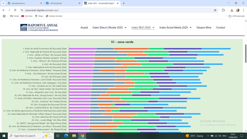 Universitățile din zona verde se află în topul clasamentului național în ceea ce privește optimizarea SEO a platformelor digitale. Acestea au un scor SEO ridicat, structură solidă de linkuri interne și externe, performanță tehnică peste medie și o prezență consistentă în social media. Site-urile sunt bine optimizate, cu timp de încărcare rapid, elemente tehnice corect implementate (metadate, structură schema, indexare), iar experiența de navigare este fluidă. Prezența unei strategii integrate între SEO on-page și off-page le face competitive inclusiv la nivel internațional.