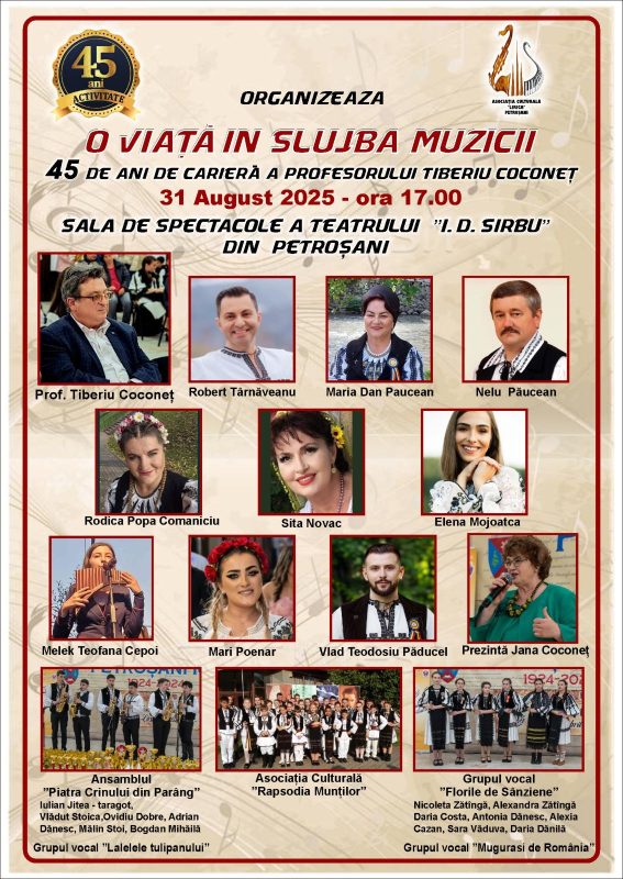 Sigur că, în mod cu totul și cu totul binemeritat pentru reputatul dascăl, aniversarea celor 45 de ani de carieră în acest domeniu al artei, nu putea să treacă fără a fi marcată printr-un concert pe măsură. Conceput de Jana Coconeț, soția prof. Tiberiu Coconeț și partenera acestuia în dezvoltarea proiectului cultural al Asociației ”Lirica” din Petroșani, concertul aniversar „45 de ani de carieră în muzică ai profesorului Tiberiu Coconeț” va avea loc duminică, 31 august 2025, pe scena din Sala Mare a Teatrului Dramatic „I.D. Sîrbu” din Petroșani”, de la ora 17,00.