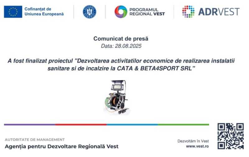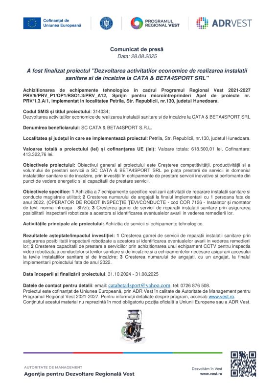 Comunicat de presă / A fost finalizat proiectul „Dezvoltarea activităților economice de realizare instalații sanitare și de încălzire la CATA & BETA4SPORT SRL”
