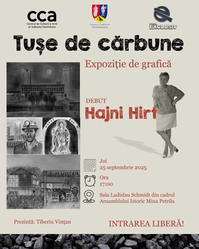 Expoziția „Tușe de cărbune” care consemnează debutul prezenței doamnei Hajni Hirt în lumea artelor plastice din regiune va avea loc joi, 25 septembrie 2025 de la ora 17,00 la Sala „Ladislau Schmidt” din cadrul Ansamblului istoric Mina Petrila, în organizarea Consiliului județean Hunedoara, prin Centrul de Cultură și Artă al județului Hunedoara, în parteneriat cu Ziarul Exclusiv.