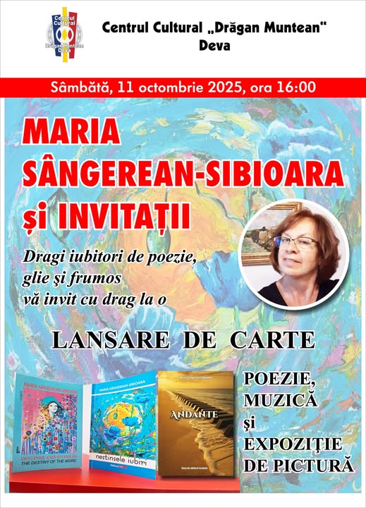 Evenimentul găzduit de Centrul Cultural „Drăgan Muntean” Deva, va avea loc sâmbătă, 11 octombrie 2025, ora 16:00, în Amfiteatrul „Liviu Oros”, unde Maria Sângerean-Sibioara și invitații vă așteaptă la o întâlnire cu arta, poezia și sensibilitatea autentică românească.