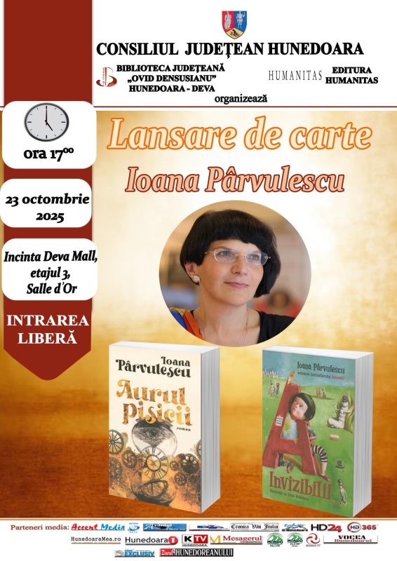Aflată pentru prima dată la Salonul Hunedorean al Cărții, scriitoarea, eseista, profesoara universitară Ioana PÂRVULESCU va oferi publicului cititor o dublă lansare de carte în cadrul unui eveniment care îi este special dedicat. Acesta va avea loc în ziua de 23 octombrie 2025, ora 1700, în incinta Deva Mall, etajul trei, Salle d’Or.