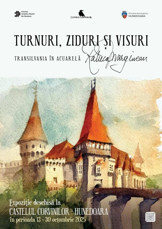 Muzeul Castelul Corvinilor de la Hunedoara găzduiește, până la sfârșitul lunii octombrie, în prestigioasa Sală Bethlen, expoziția de pictură „Turnuri, Ziduri și Visuri. Transilvania în acuarelă”, semnată de artista Raluca Mărginean.