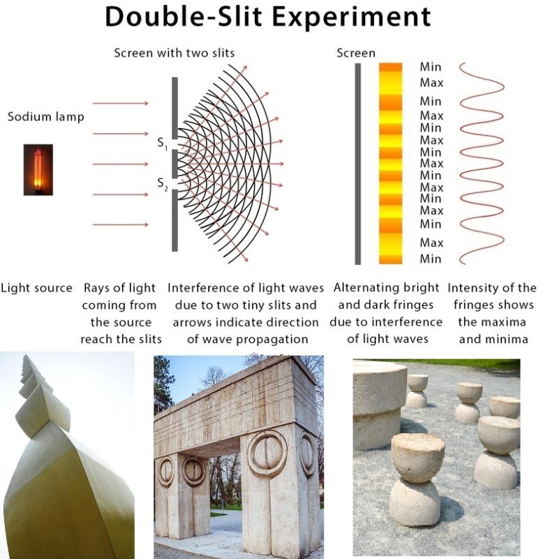 Iată indicii: strămutat la Paris, Brâncuși a fost aproape de izvoarele și creuzetul mecanicii cuantice. Așa încât nu-i surprinzător că monumentala sa tripletă poate fi privită ca o uriașă machetă a legendarului micro-experiment lansat de Thomas Young, dar fundamentat de ducele francez Louise de Broglie, contemporan cu Brâncuși.