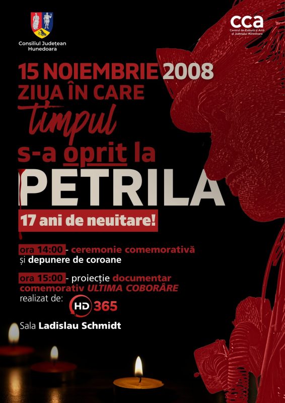 Și în acest an, Ansamblul Istoric „Mina Petrila” este martor tăcut al unui eveniment ceremonial dedicat zilei în care aici timpul s-a oprit în loc pentru alți 15 eroi din adâncuri, dar și pentru cei peste 150 de ani de minerit în cea mai veche mină de cărbune din Valea Jiului. Evenimentul comemorativ va avea loc aici sâmbătă, 15 noiembrie 2025, de la ora 14,00 cu o slujbă religioasă de pomenire a minerilor decedați, cu depuneri de coroane de flori în memoria acestora și cu o evocare a evenimentelor din 15 noiembrie 2008. Evenimentul comemorativ este organizat de Consiliul județean Hunedoara, prin Centrul de Cultură și Artă al județului Hunedoara.