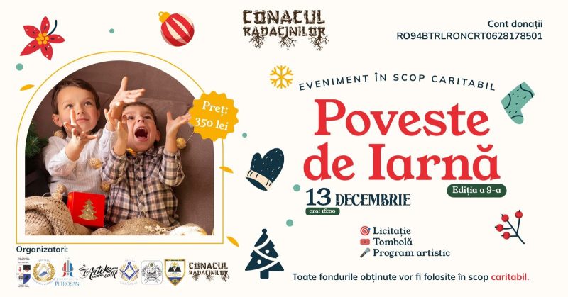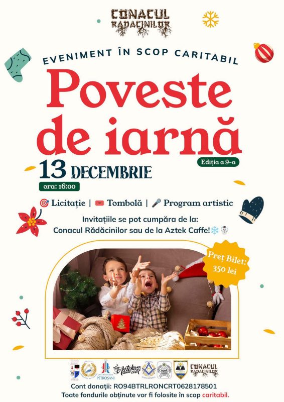 Ajuns la cea de-a noua ediție, acest eveniment va avea loc sâmbătă, 13 decembrie 2025 de la ora 16.00 la sala de evenimente „Conacul Rădăcinilor” de la Jieț-Petrila unde sunt așteptați toți cei care, în schimbul unei donații de 350 de lei își pot rezerva un loc la balul caritabil al acestei deosebit de frumoase ”povești de iarnă”, în așteptarea sărbătorii sfinte a nașterii Domnului nostru Iisus Hristos. O seară în care, dincolo de bucuria reîntâlnirii cu o seamă artiști remarcabili și dincolo chiar de posibilitatea de a intra în posesia unor valoroase lucrări de artă plastică aparținând unor reputați artiști ai Văii Jiului, care vor fi licitate în scop caritabil, veți avea ocazia de a fi parte dintre cei care aprind împreună flacăra speranței celor care, deși sunt valoroși, au mai puține posibilități materiale.