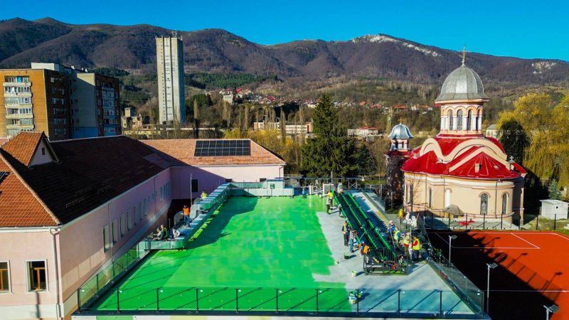 Ineditul acestui proiect îl constituie, desigur, realizarea unei inovații care a permis amenjarea unui teren de sport cu gazon artificial și cu tribune pentru suporteri, construit pe acoperișul noii săli de sport care completează vechiul corp al clădirii școlii. Primarul Lucian Resmeriță spune că a fost aleasă această soluție tehnică din pricina constrângerilor de spațiu dar și a dorinței de a pune și la dispoziția elevilor de la această școală un teren de sport cu gazon artificial și o sală de sport, așa cum există și la celelalte unități de învățământ din localitate.