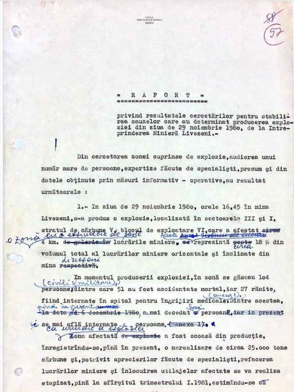 Și nu în ultimul rând, în arhiva CNSAS, am descoperit o ciornă a unui Raport privind rezultatele cercetărilor pentru stabilirea cauzelor care au determinat producerea exploziei în ziua de 29 noiembrie 1980, de la Întreprinderea Minieră Livezeni, întocmit de Securitate[2]. Informațiile din Raport ”meu” și Procesul verbal de cercetare ”al domnului Boboc”, fără a fi identice, este clar că vorbesc despre același eveniment, aceeași oră, același număr de victime, etc. Aveți mai jos prima pagină a acestui raport.