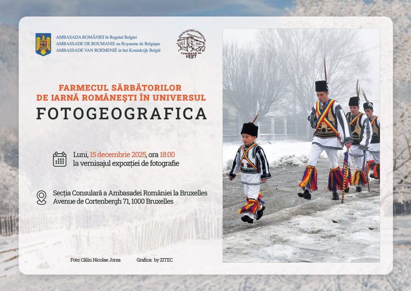 Ambasada României în Regatul Belgiei, în parteneriat cu Casa de Cultură a Studenților București, organizează luni, 15 decembrie 2025, începând cu ora 18:00, la sediul Secției Consulare a Ambasadei României la Bruxelles, din Avenue de Cortenbergh 71, 1000 Bruxelles, vernisajul expoziției de fotografie ”Farmecul sărbătorilor de iarnă româneşti în universul FOTOGEOGRAFICA” .